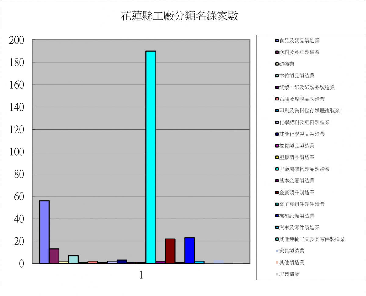 花蓮地處東隅,唯工業類仍以地方性資源產業為主,然投資環境佳,宜於精密工業,由於興辦工業人對環境缺乏瞭解,以致裹足不前,影響發展,茲將花蓮民國114年工廠分類表如下:(調查年:114年)