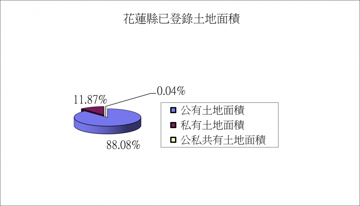 花蓮縣已登錄土地面積狀況如表示。公有土地約佔88.08%左右,顯示花蓮縣擁有廣大而未開發土地資源,對產業投資取得土地成本應可較為低廉。