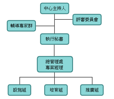 組織架構為:中心主持人→評審委員會/輔導專家群→ 執行秘書→總管理處專案經理→設施組、培育組、推廣組。