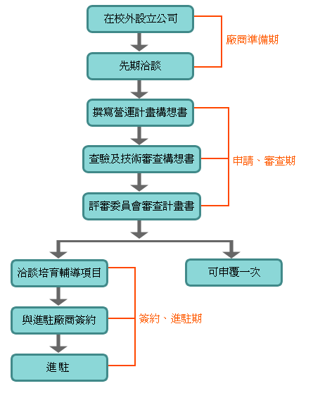 申請資格流程:廠商準備期(在校外設立公司→先期洽淡)→申請、審查期(撰寫營運計畫構想書→查驗及技術審查構想書→評審委員會審查計畫書)→簽約、進駐期(洽談培育輔導項目→與進駐廠商簽約→進駐)或可申覆一次。