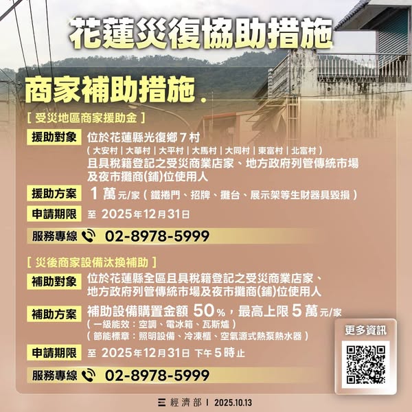 災後商家設備汰換補助補助對象:位於花蓮縣全區且具稅籍登記之受災商業店家、地方政府列管傳統市場及夜市攤商(鋪)位使用人