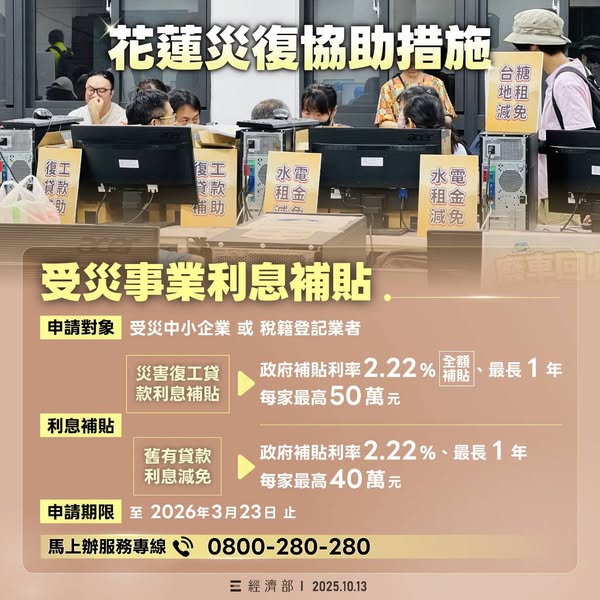 馬上辦服務專線0800-280-280對補助方案有任何疑問或需要協助,請隨時洽詢各窗口服務專線。經濟部將持續協助花蓮鄉親,完成災後重建工作。